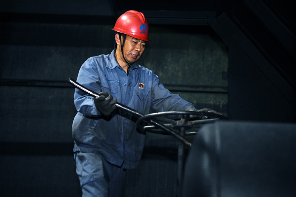 图2:原煤卸完后,班长黄平均用撬棍拧紧铁盘关闭车门。