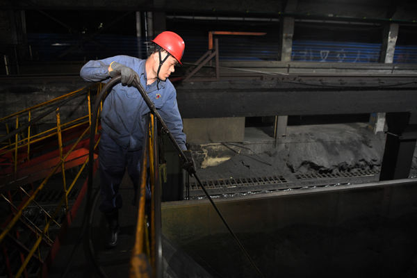 图3:装卸工韩伟用风管清理车皮内部积煤。
