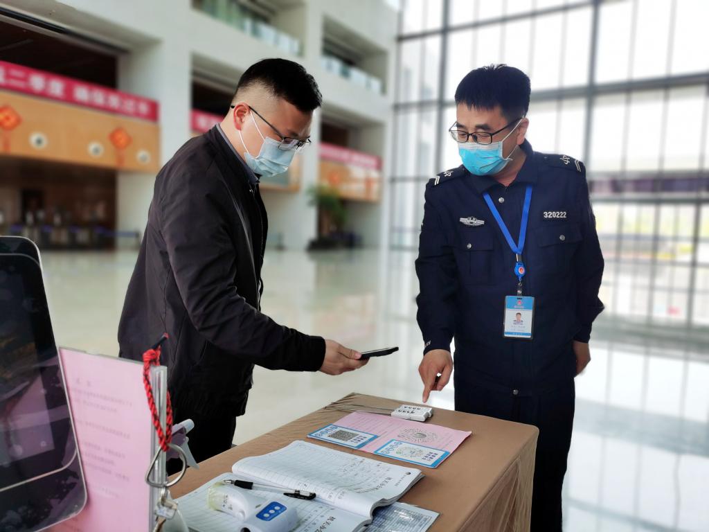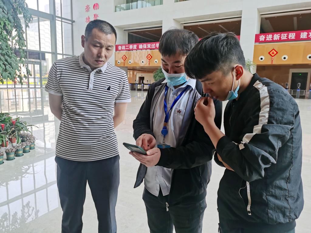 5月2日上午10:10,办公中心西门岗值班职工孙正国(左一)在对访客做疫情防控“双码”检查。他表示,“五一”期间也要严格把好“入口关”,坚决保证疫情防控安全。