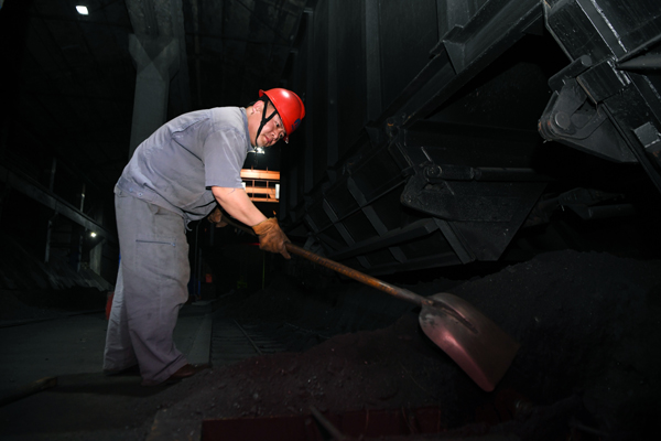 图4:装卸工张勇用铁铲清理车道旁的积煤。