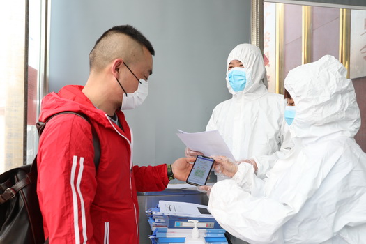 10:15,办公中心大厅安保人员刘志强检查进入大楼人员行程码。他说,要守住进入大楼的“最后一关”,保证秩序平稳、卫生安全。