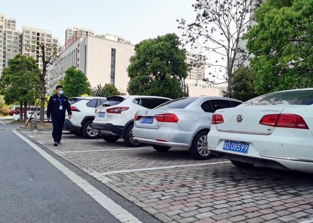 10:12,行政事务服务公司职工王银双在车场巡查,当天,他要负责对办公中心院内和大楼各个区域安保、消防情况进行全天候走动巡查,及时处置突发性事件。