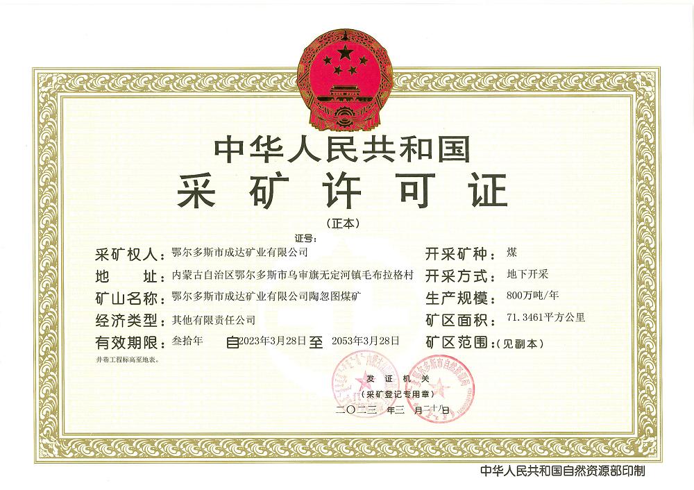 下属成达矿业有限公司颁发了陶忽图煤矿采矿许可证。这标志着电竞博彩app