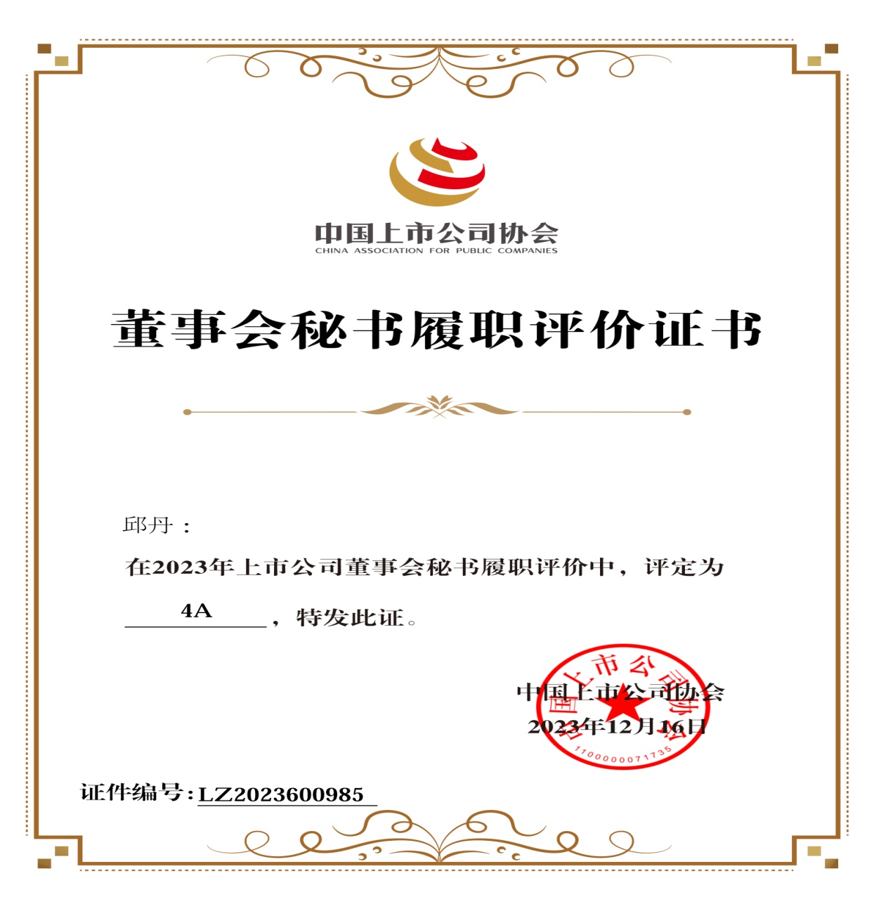 副总经理、董事会秘书邱丹连续两年荣获董事会秘书履职4A评级,证券投资部首次荣获董办优秀实践案例。