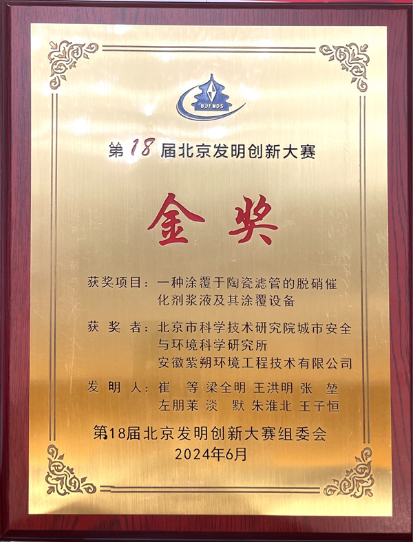 日前,在第18届北京发明创新大赛颁奖典礼上,紫朔环境公司凭借卓越的研发实力,“一种涂覆于陶瓷滤管的脱硝催化剂浆液及其涂覆设备”的创新项目获得大赛金奖。