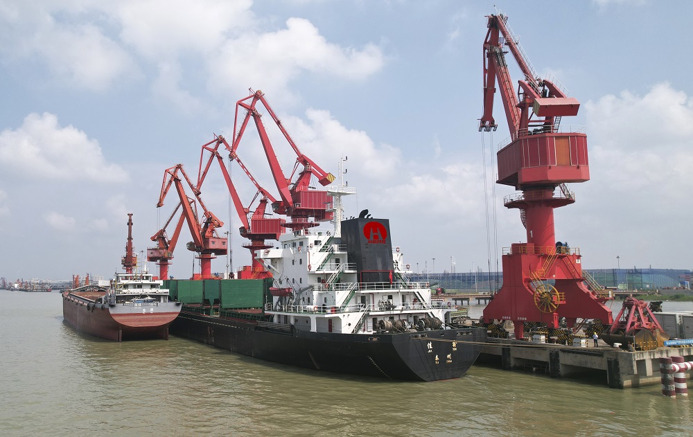 南京航运公司货船正在港口装运煤炭。(李晓亮 摄)
