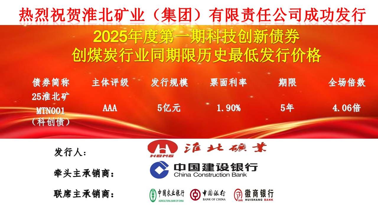 在银行间市场成功发行2025年第一期科技创新债券——25淮北矿MTN001(科创债),发行规模5亿元,期限5年,票面利率1.90%,全场认购倍数4.06倍,创煤炭行业同期限债券价格最低、集团债券票面利率新低,充分显示资本市场对电竞博彩app