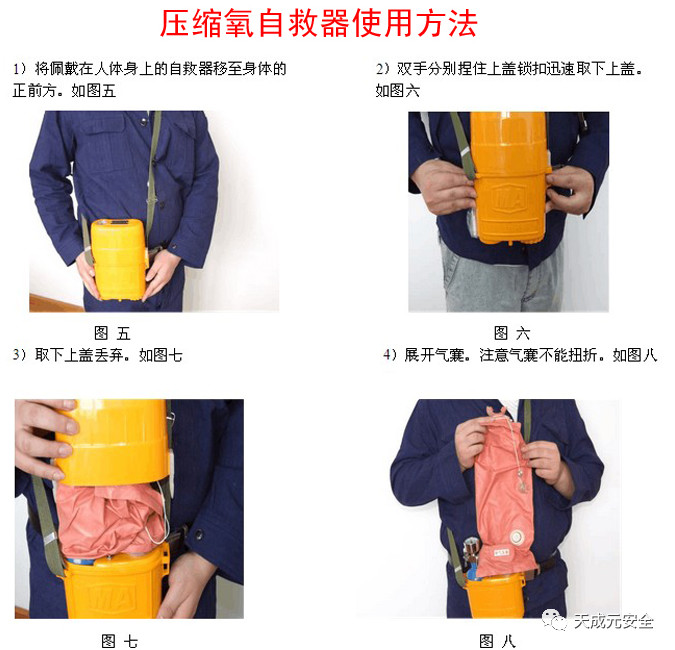 1)佩戴时将自救器移至右前方,左手拖住自救器底部,右手打开保护套,用大母指用力搬开开启扳手;